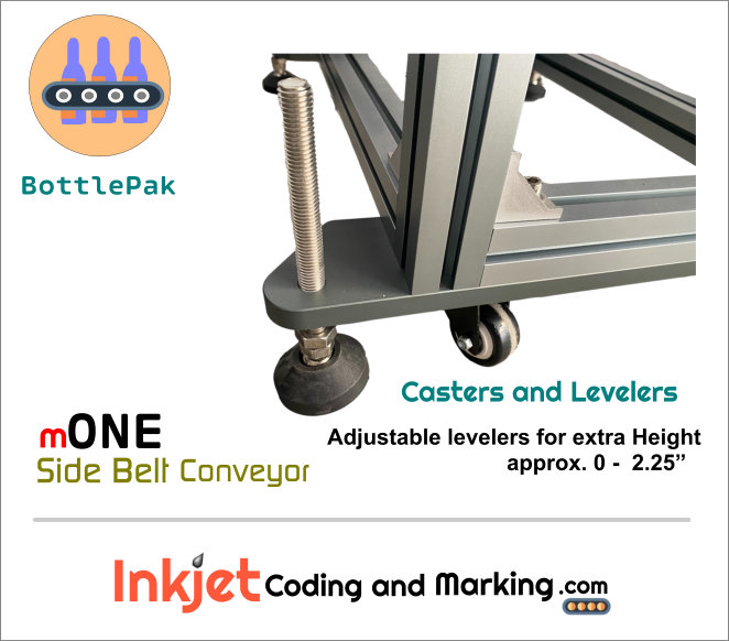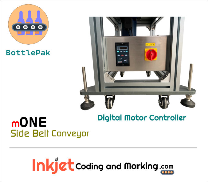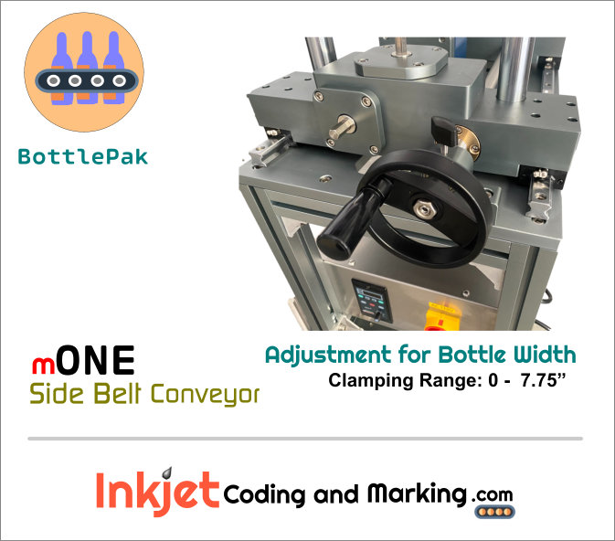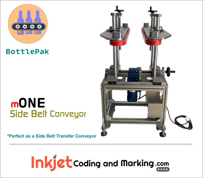 The mONE Side Belt Conveyor can be deployed as a Bottom Coder for CIJ Inkjet Printers, or simply as a Gap Transfer Conveyor with adjustable Side Belt Grippers for any packaging line.