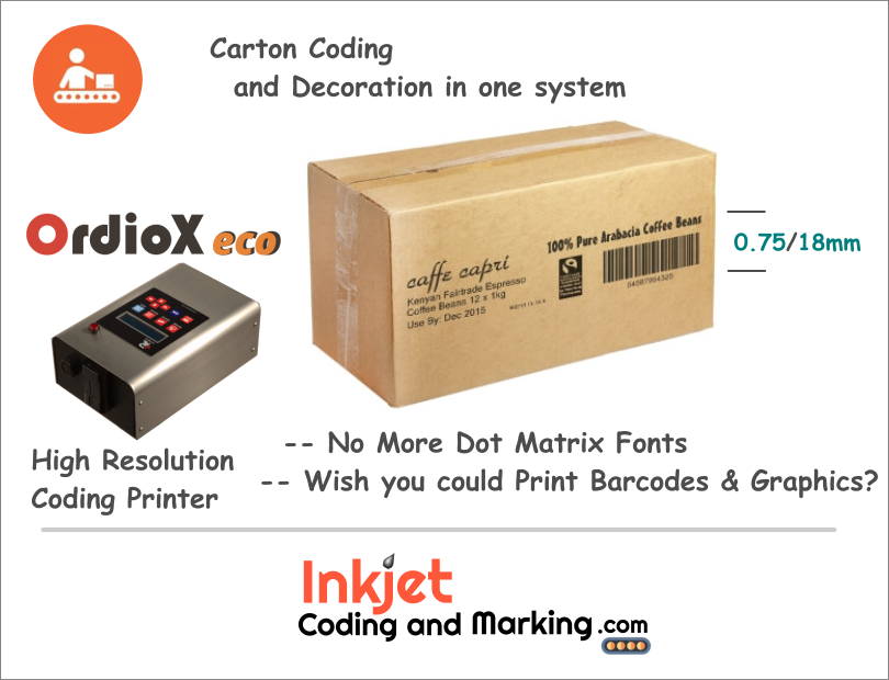 The OrdioX eco provides an High-Tech alternative to the out-dated Marsh Unicorn dot matrix printer from VideoJet. With it's robust High Resolution output and a standard Print-Height of .75 / 18mm, you can perform both Case Carton Coding aas well as Case Decoration with this Coding Printer.