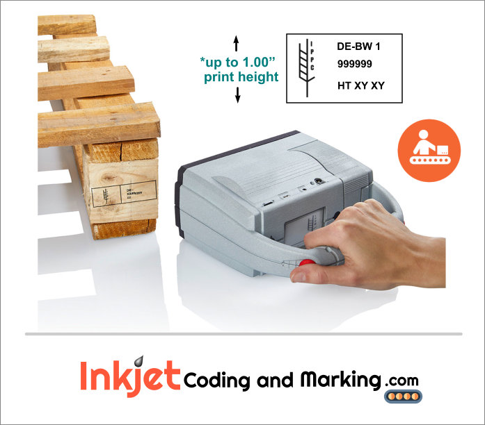 The Handheld Printer that can print High Resolution with up to a 1.00" inch Print Height. Fully Mobile Handheld Inkjet Printing of Text, Barcode, Product Graphics onto Wood-Pallets, Metal and Plastic.