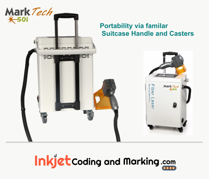 The MarkTech 50i Portable Laser Engraver processes metal materials like Steel, Aluminum, Brass and some Plastics. Now you can Laser Mark and Laser Label via directly marking onto products and parts. Easily configure for printing Serial Numbers, Date and Time Code Marking, Stencil Text characters. This Laser Marking Machine can also Print Graphics in raster or vector formats and will produce machine-readable 1D Barcodes, QR Codes & the industrial 2D Datamatrix Code. The MarkTech 100i Handheld Portable Laser Engraver is mobile, with Handheld Laser Engraver head and easy to operate and program to produce Permanent Marking and Coding. Powerful 100W Fiber Laser Engraver equipped in this Handheld Metal Laser Engraver and weighs approximately 39 pounds, for practical portable laser engraving.