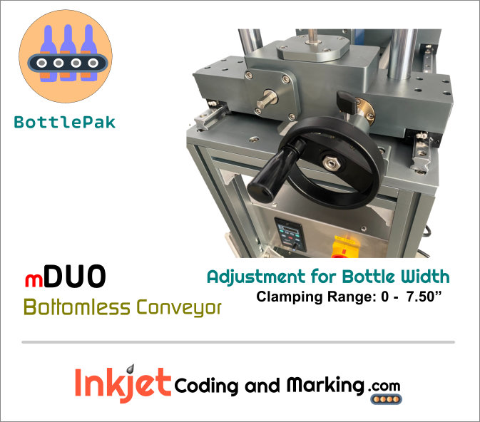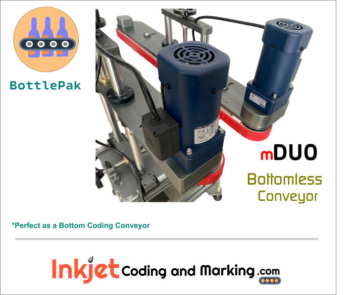 The mDUO Bottomless Conveyor can be deployed as a Bottom Date Coder for Inkjet Bottle Printing, or simply as a Side Belt Transfer Conveyor with adjustable Side Hugger Belts for any round and bottle packaging.