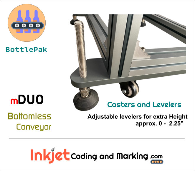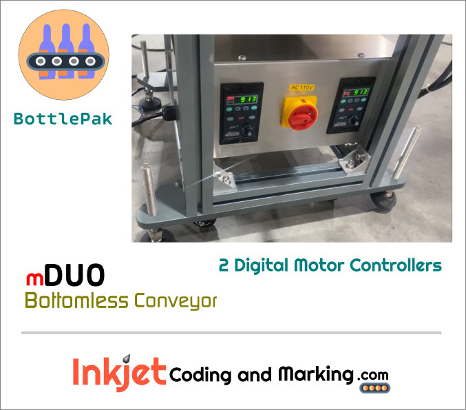 The BottlePack mDUO Bottomless Conveyor offers unique design with Two-Motors that can be independantly controlled by two Digital Controllers. Affordable pricing for a Side Grip Bottom Coding Conveyor.