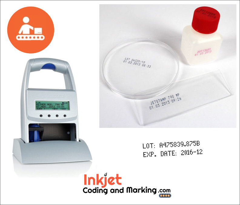 The jetStamp 790MP can be configured for One or Two line imprints. This Reiner Inkjet is a handheld ink-jet printer that directly prints on products, parts, currugated boxes or documents, simply and quickly. Easily configure this JetStamp for Handheld Inkjet Printing of Lot numbers, Expiration date, time and any Text. With the MP ink or QDX Ink, the print will adhere to non-absorbent surfaces such as metal and plastic, or glass. The JetStamp 790MP is mobile, handy and easy to operate and program. It comes complete with its own software and weighs just under 1 pound.
