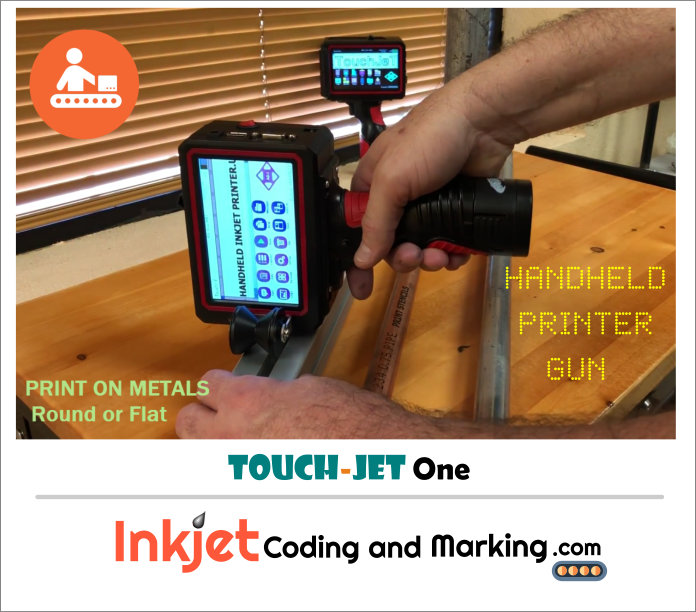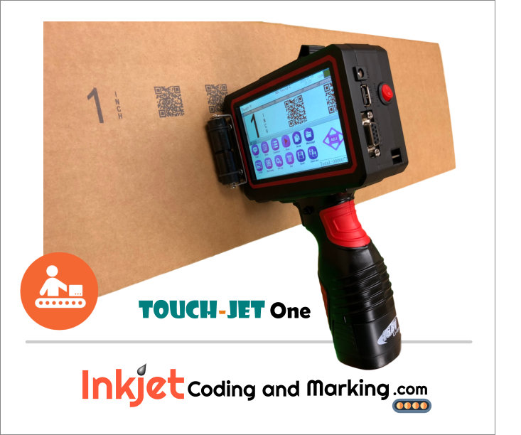 The TouchJet ONE is a High Resolution Handheld Printer. This is a Handheld Inkjet Printer capable printing crisp Text characters and Date and Time jetStamps. Also the TouchJet One can be configured for up to One-Inch Handheld Printer Height for Graphics, Logos and legible 1D Barcode and 2D QR Barcodes, that are accurately read by a Barcode scanner. The built-in Touchsreen makes for the most responsive and intuitive operation found in a Handheld Portable Inkjet Printer.